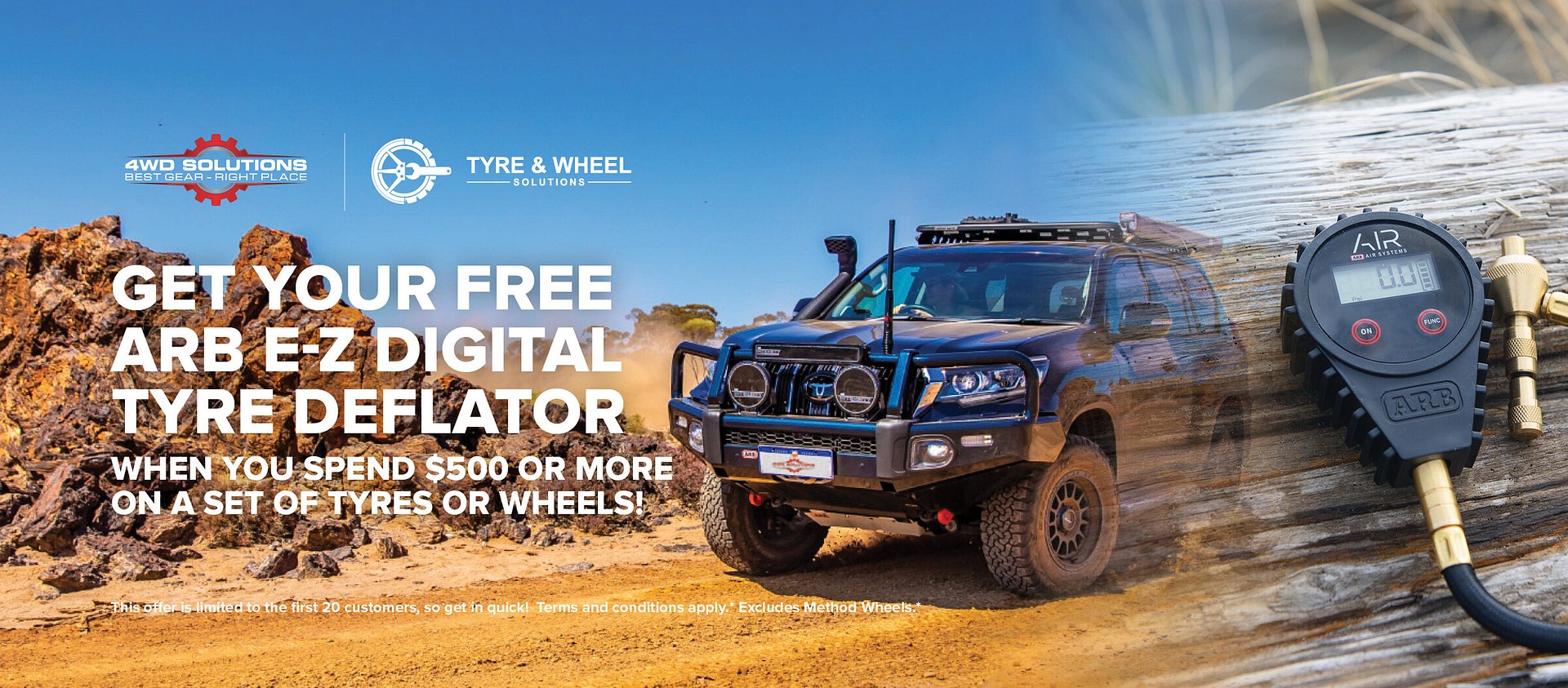 To be eligible for a free FREE ARB E-Z Digital Tyre Deflator, customers must purchase tyres or wheels up to the value of $500 from Tyre and Wheel Solutions. Labour and services are not included in this total cost. The first 20 customers to pay their invoice in full will be eligible.