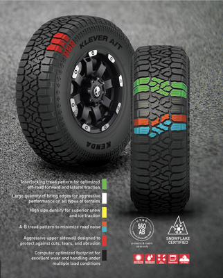 Designed at the Kenda American Technical Center in Akron, OH, this 2nd generation tyre delivers a smooth, quiet ride without sacrificing traction. With strong durability, combining aggressive styling and an optimized tread design, the Klever A/T2 is the right solution for SUV, light truck and 4x4 owners on the road, in the snow or in most off-road environments.