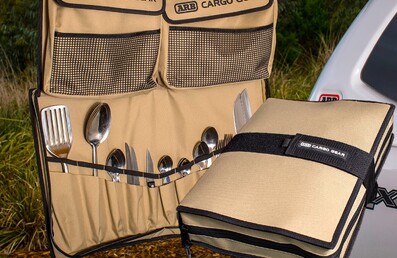 The Track Pack from 4WD Solutions - I liked the idea of externally storing the smelly stuff. The design gives you a few extra pockets for storing stuff that you often need when working on or around the outside of the truck. In my case, the obligatory Morley's on one side, some rubbish bags and window wiper fluid on the other, and a couple of levelling blocks in the side." - Kerry